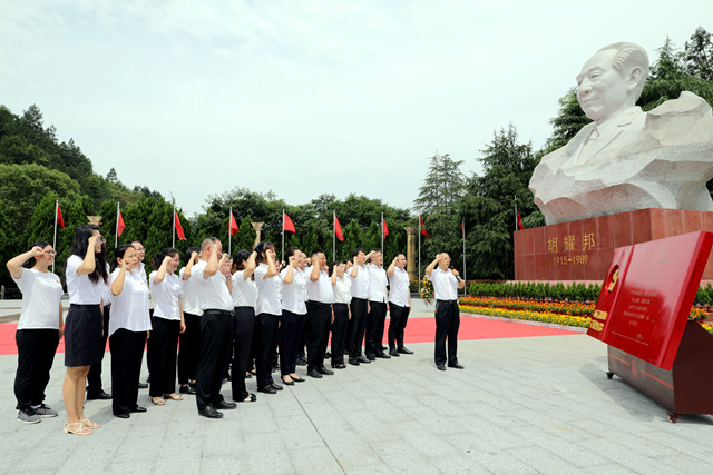 黨支部書記李志成帶領(lǐng)全體黨員同志在胡耀邦塑像前重溫入黨誓詞
