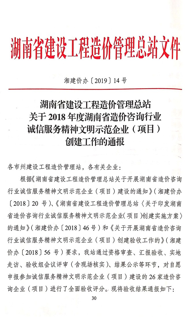 湖南省建設(shè)工程造價管理總站 關(guān)于2018年度湖南省造價咨詢行業(yè) 誠信服務(wù)精神文明示范企業(yè)(項目) 創(chuàng)建工作的通報